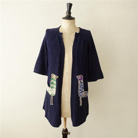 デザイン:mina perhonenのmingling ロングニットカーディガンです。カラーはネイビーベースにグリーン・ブルー・ベージュ・パープル・グリーン系カーキの柄編みで、やや粗目の綿ニット地です。フロントオープンデザインで、袖口&裾両サイドにスリット入りです。フロント左右&右ヒップにポケットがあり、襟ぐり・前立てはリブ編みで、袖口・裾は伏せ止め仕上げです。柄部分には目や足にボタンが使われております。