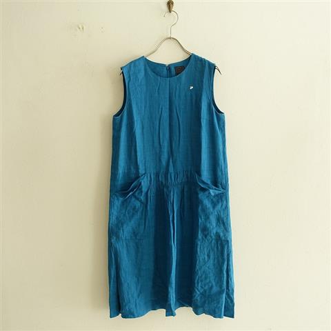 デザイン:mina perhonenのNordic ノースリーブワンピースです。カラーはブルーで、薄手のリネン地で仕立てられています。後ろフック&ファスナーで着脱でき、両サイドにポケット、左胸にワンポイント刺繍入りです。裏地付き。