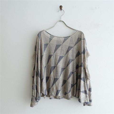 デザイン:mina perhonenのmontagne リネンニットプルオーバーです。カラーはグレーベージュベースにグレーの総柄で、透け感ある薄手の麻スラブニット地です。身幅広めのゆったりとしたデザインで、袖口はリブに切り替えられております。