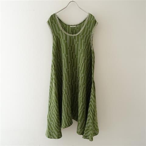 デザイン:mina perhonenのcrests コットンガーゼスリーブレスサーキュラードレスワンピースです。カラーはモスグリーン×ホワイトで、柄織のガーゼ地で仕立てられており、小さなお花のモチーフ編みレースがあしらわれております。かなりフレアなシルエットになっており、定価48,300円(税込み)の商品です。