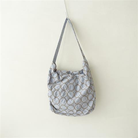 カラーはブルーグレーベースにブラウンで「tambourine」のテキスタイル刺繍が施されたデザインです。