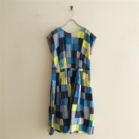 デザイン:mina perhonenのjelly ワンピースです。カラーはブルー×イエロー×グレー×ネイビー×ライトベージュなどのボックスチェック柄で、麻の薄手素材です。ウエストにタック入りの切り替えが施されており、バックのフック&ファスナーで着脱できます。裏地付きで、ポケットは付いておりません。