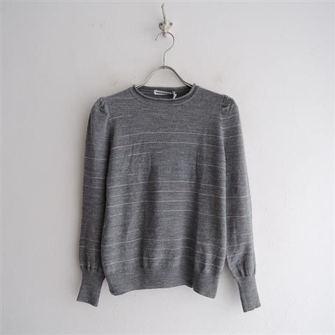 デザイン:mina perhonenのcontrailニットです。カラーは杢グレー×薄ピンク(表記はグレー)で、ひこうき雲のように儚い線が織り込まれたテキスタイルです。本体価格34,000円(税抜き)の商品です。