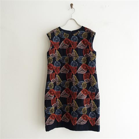デザイン:mina perhonenのhana no mi 刺繍ノースリーブワンピースです。カラーはネイビーで、起毛がかった素材ベースに、テキスタイル刺繍があしらわれたデザインです。後ろフック&ファスナーで着脱でき、両サイドにポケット&裏地付きです。