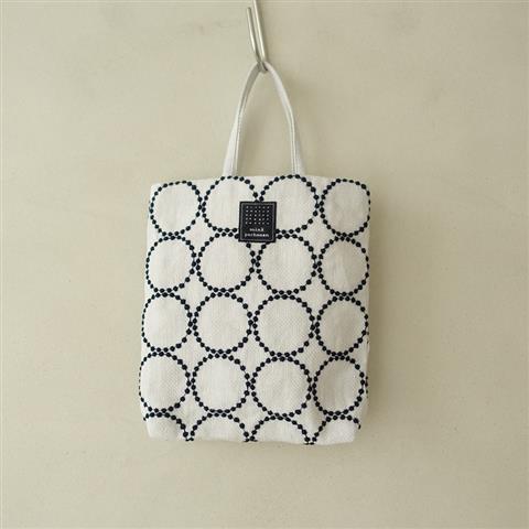 デザイン:mina perhonenのtambourine トーストバッグです。カラーはホワイトベースに、ダークネイビーのタンバリンの刺繍が施されたデザインとなっております。(表記はlight gray)開口部はオープンで、光沢のあるホワイトの裏地付きです。ポケットはございません。素材は、表生地が麻88%、綿12%で、刺繍部分の上糸が綿100%、下糸がポリエステル100%で、裏生地がキュプラ100%です。