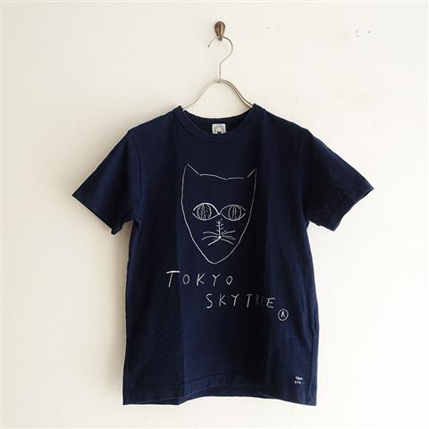 デザイン:mina perhonenとTOKYO SKY TREEコラボ「tree o miteru」のプリントTシャツです。カラーはネイビー×ホワイトです。コットンの天竺ニットで仕立てられています。フロントには、目にスカイツリーが移っている猫が描かれ、左裾には刺繍が施されております。
