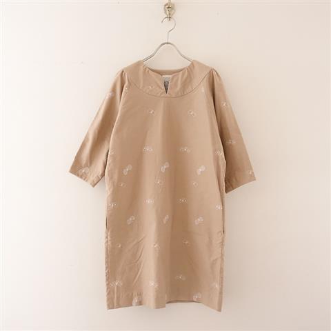 デザイン:mina perhonen laundryのchoucho 刺繍ワンピースです。カラーはピンクベージュ地にホワイト刺繍、やや厚手素材で、前両腰にポケットがございます。裏地はなく、前衿ぐりにV字カットが施され、ラグランスリーブのデザインです。