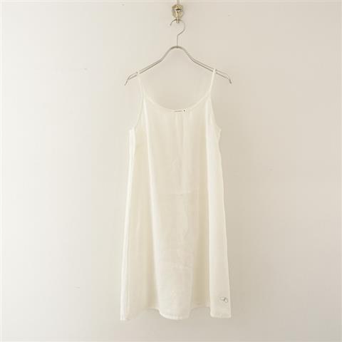 デザイン:mina perhonenのペチワンピースです。カラーはオフホワイトで、やや透け感のある薄手素材です。プルオーバータイプで、前左裾に蝶々刺繍が施されております。