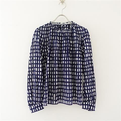 デザイン:mina perhonenのsora check 総柄プルオーバーブラウスです。カラーはネイビー×ホワイト、やや透け感のある薄手素材で、背ドロップホール上のループボタンで着脱できます。衿ぐりにギャザー&フリルが施され、袖口ボタン開閉です。