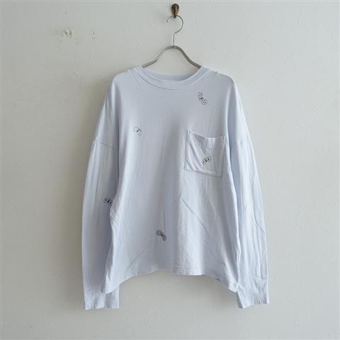デザイン:mina perhonenのchoucho ドロップショルダー刺繍ロングTシャツです。カラーはサックス×チャコールグレーで、全面にチョウチョの刺繍があしらわれております。パッチポケットがひとつ付いております。