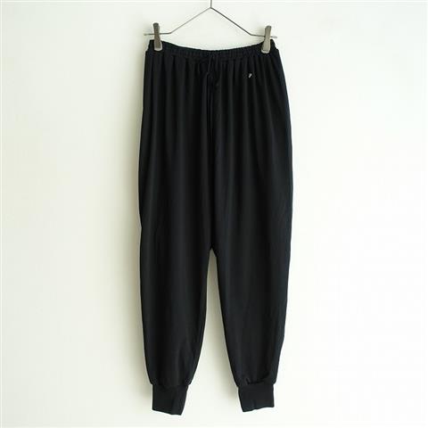 デザイン:2020-2021年AWコレクションmina perhonenのtanssi カットソーパンツです。カラーはブラックで、薄手カットソー地で仕立てられております。ウエストはゴム&ひも入り、裾はリブに切り替えられており、両サイドにシームポケットが付いております。左腰にホワイトでチョウチョのワンポイント刺繍入りで、定価19,800円(税込み)の商品です。