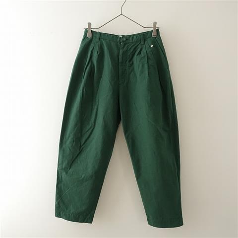 デザイン:mina perhonenのluonto コットンタックパンツです。カラーはグリーンで、ボタン&ファスナーで着脱できます。両腰&両ヒップにポケット、ウエストにタックが施され、「蝶」のワンポイント刺繍があしらわれております。