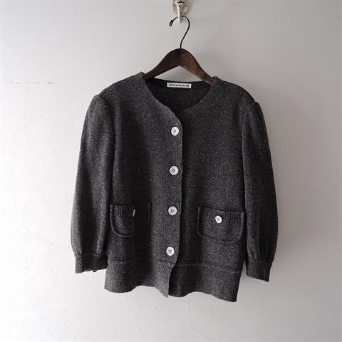 デザイン:mina perhonenのnostalgia ニットカーディガンです。カラーはダークグレーミックスで、ニット地で仕立てられています。ボタン開きで、両サイドにポケット付きです。 (掲載写真は、実商品のカラーにできるだけ近づけるよう努力はしておりますが、お使いのモニターや画面設定等によっては、色が異なって見える場合もございますので、予めご了承下さい)