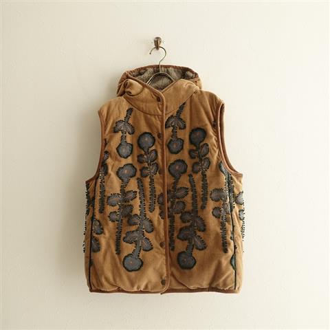 デザイン:mina perhonenのfrost garden ダウンベストです。カラーはライトブラウン地に濃いグレー・ダークグリーン刺繍、フロントスナップボタン&ジッパーで、前両腰にポケットがございます。裏地付きで、フード内側にボアがあしらわれ、定価は78,000円(税抜き)です。