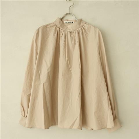 デザイン:2020年コレクション mina perhonen「adagio」のコットンバンドカラーギャザーブラウスです。カラーはベージュです。細い綿糸で、高密度に織られた生地で仕立てられています。シルキーな光沢感があり、うっすら透け感がございます。左肩とカフスはボタン開き、ネックラインと袖口に細かなギャザーがあしらわれ、ゆったりとしたブラスです。裾サイドはガゼット仕様のラウンドカットです。定価は38,500円(税込)の商品です。