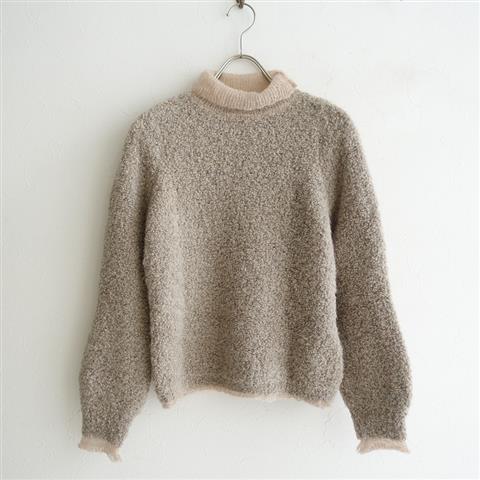 デザイン:mina perhonenのAndes ハイネックブークレーニットプルオーバーです。カラーはベージュで、もこもことしたブークレー糸で仕立てられています。プルオーバータイプの着脱で、ネック部や袖口にはゆるく編まれたモヘアの切り替えが施されています。定価は45360円の商品です。