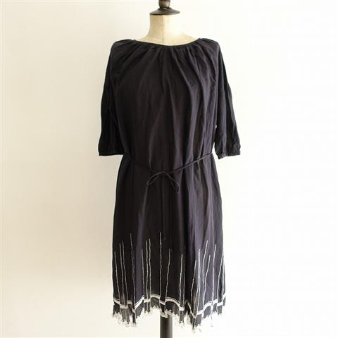 デザイン:mina perhonen laundry「waltz」のエンブロイダリーベルテッドワンピースです。カラーはネイビー×ホワイトです。細かなシボが入った、透け感のある薄手の綿生地に、刺繍があしらわれております。後ろネックがボタン・ループ開きのプルオーバーワンピースで、ベルトループ&腰ひも付きです。ネックラインや前肩・袖山・袖口のはギャザーが施されております。裏地・ポケットはございません。本体価格は50,000円+税の商品です。