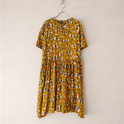 デザイン:mina perhonenのsonata ウールシルク混プリントドレスワンピースです。カラーはライトピンクベースに、マスタード・ダークブラウン・チャコールグレー・グレーの花柄プリントの薄手生地で仕立てられており、裏地が付いております。ウエスト切替部はギャザー入りで、バックファスナー半開で着脱できます。