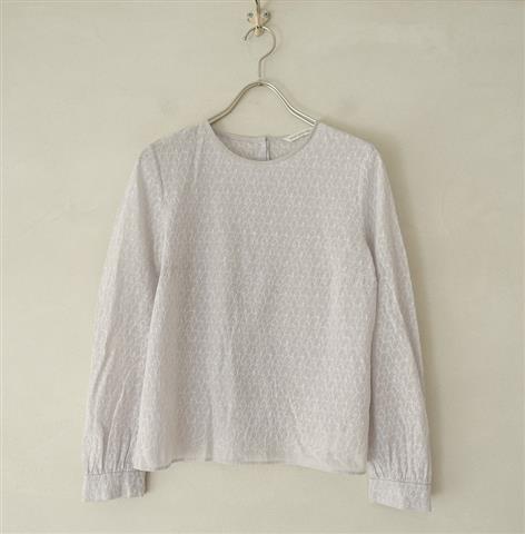 デザイン:mina perhonenのlintu ノーカラーブラウスです。カラーはライトグレー、やや透け感のある薄手素材で、バックボタンです。全体にホワイトの刺繍があしらわれ、袖口ボタン開閉で、定価は43,200円です。