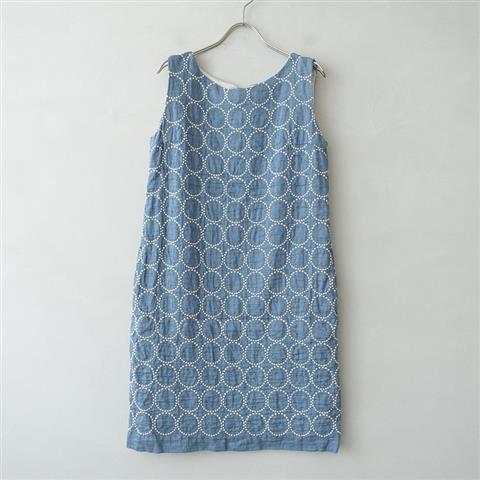デザイン:mina perhonenのtambourine スリーブレス刺繍ドレスワンピースです。カラーはライトブルー×ホワイトで、全面にテキスタイル刺繍があしらわれており、裏地が付いております。バックファスナー半開で着脱でき、両サイドにシームポケットが付いております。