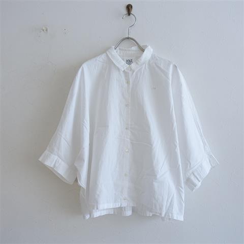 デザイン:mina perhonenのdew コットン7分袖ドルマンシャツです。カラーはホワイトです。背上部にボックスタック入りで、ゆったりとしたワイドなシルエットになっており、左胸にチョウチョのワンポイント刺繍があしらわれております。