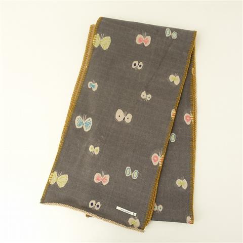 デザイン:mina perhonenのhana hane ストールです。カラーはグレーベースに、ホワイト、オレンジ、ブルー、ピンクなどで蝶々が描かれたテキスタイルデザインです。裏面はライトブラウンの無地となっております。