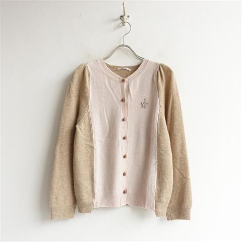 デザイン:mina perhonen「poem」のカシミヤニットバイカラーカーディガンです。カラーはピンク&ブラウンベージュ杢で、カシミヤの柔らかな、軽量ニットです。皮革風のラップボタン開きで、袖山にはギャザーがあしらわれております。左胸には、蝶々のモチーフが施されております。