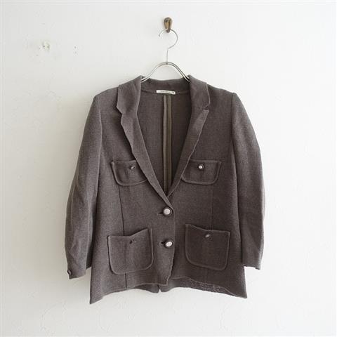 デザイン:mina perhonenのnostalgia リネンニット七分袖ジャケットです。カラーは濃グレーブラウンで、リネンニット地で仕立てられております。フロントのシェルボタン開閉で着脱でき、ポケットが4つ付いております。