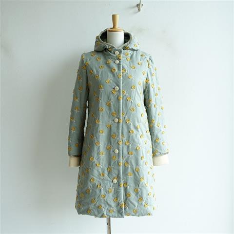 デザイン:mina perhonenのskip 刺繍ダウンコートです。カラーはグレーベースに、マスタード・ベージュの刺繍があしらわれており、花たちが互いにささやきあいながらスキップをするように舞う様子を表現したテキスタイルです。フロントボタンで、両腰&右胸内側にポケット、フード周りと袖口に光沢感のあるベルベットパイピングが施されています。袖口はリブ仕様で、ボーダー柄の裏地付きです。フード裏にはベルベット生地が使用されており、羽毛入りで、定価151,200円の商品です。