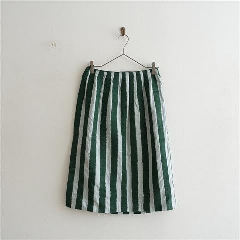 デザイン:mina perhonenのriviera ストライプ柄パイル刺繍スカートです。カラーはサックス×グリーンで、ストライプ状にパイル刺繍があしらわれております。左腰ファスナー開閉で着脱でき、裏地付き、本体価格は40,000円(税抜き)です。