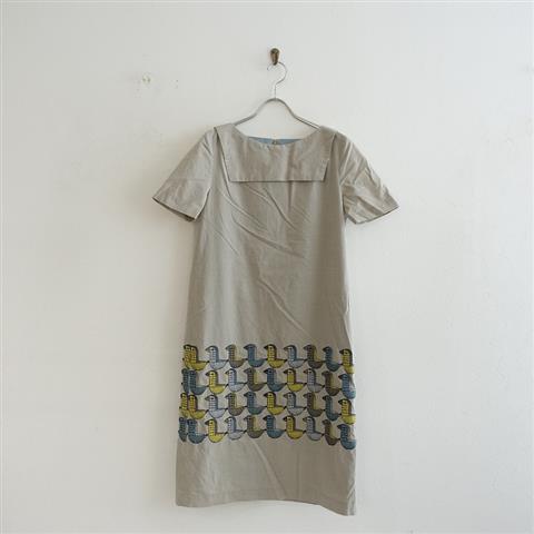 デザイン:mina perhonenのwood bird コットン刺繍ワンピースです。カラーはライトグレーベージュで、薄手素材です。バックセンターホック&ファスナー着脱式で、デザインセーラーカラーが施されております。裾上にイエロー・ライトブルー・ブラウン・ブラックなどのテキスタイル刺繍があしらわれえおり、袖以外はライトブルーの裏地付きです。定価56,700円の商品です。