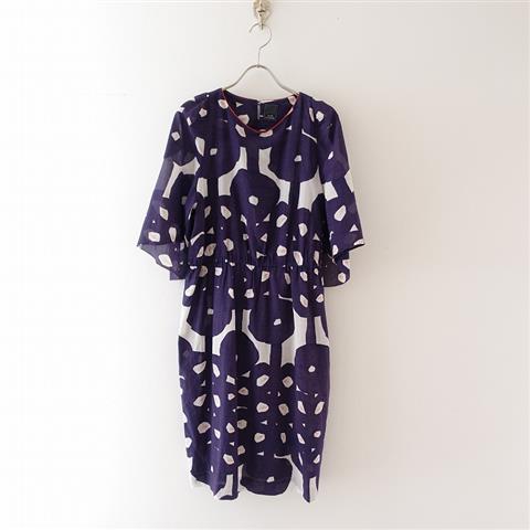 デザイン:mina perhonenのhana tricot フレアスリーブプリントドレスワンピースです。カラーは薄めのパープル・ホワイト・オレンジで、総柄プリントの透け感のある薄手生地で仕立てられております。バック襟元のボタン開閉のプルオーバータイプで、ウエストはゴム入りです。