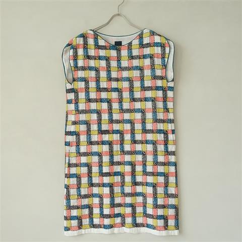 デザイン:mina perhonenのcantuccioワンピースです。カラーはオフホワイトベースにブルーグリーン・サーモンピンク・マスタードなどのテキスタイル刺繍があしらわれており、プルオーバータイプです。両腰辺りにポケットがあり、裏地付きです。
