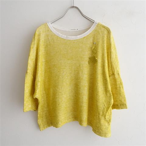 デザイン:mina perhonenのwafer リネンダブルフェイスプルオーバーです。カラーはイエローで、表の生地はその名の通りウエハースのように細かなメッシュ状生地で、裏地はコットンガーゼのダブルフェイス地で仕立てられております。袖丈は七分くらい、お花&鳥さんの刺繍モチーフがあしらわれております。