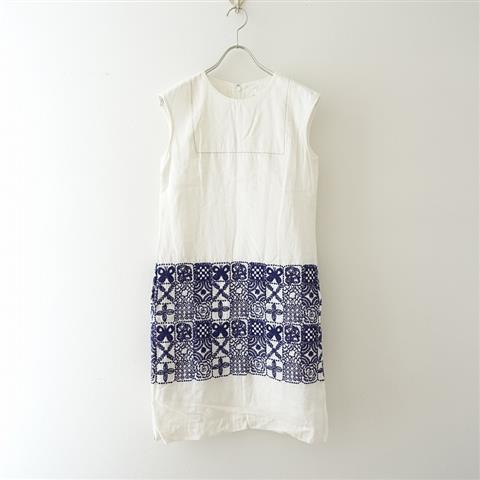 デザイン:mina perhonen laundryのforest tile リネン刺繍ドレスワンピースです。カラーはオフホワイトでリネン特有の張りのある薄手生地で仕立てられており、ネイビーで刺繍があしらわれております。ヨーク部はステッチが施されており、両サイドにシームポケットが付いており、バックファスナー半開で着脱できます。裏地付きです。
