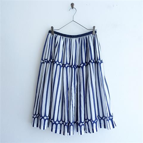 デザイン:mina perhonenのfinger stripe ギャザースカートです。カラーはホワイト×ネイビーで、大きな楕円がストライプ状に描かれたようなfinger stripeのテキスタイルプリントがあしらわれたやや透け感のある薄手生地で仕立てられています。後ろループボタン&ファスナーで着脱でき、裏地付きです。定価は48000円+税の商品です。