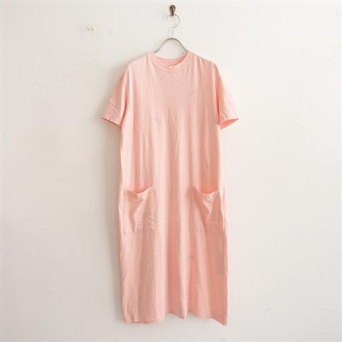 デザイン:mina perhonenのchoucho 刺繍カットソーワンピースです。カラーはピンクで、ライトグレーのテキスタイル刺繍があしらわれたカットソー地で仕立てられています。プルオーバータイプの着脱で、両サイドにポケット付きです。定価は22,000の商品です。