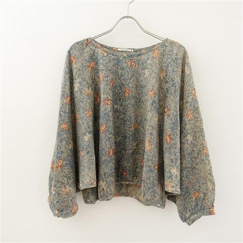 デザイン:mina perhonenのunforgettable moment プリントドルマンブラウスです。カラーはブルー、ベージュ、チャコール、オレンジなどで、鉛筆で描いたような線画とお花のプリントデザインで、微起毛の薄手生地で仕立てられています。プルオーバータイプの着脱で、ゆったりとした身幅のラグランのドルマンスリーブデザインです。