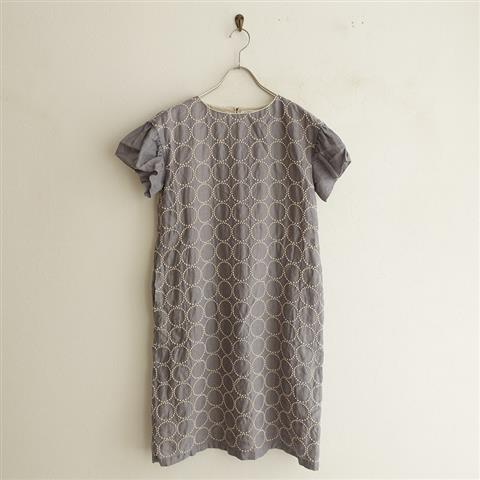 デザイン:mina perhonenのtambourine 刺繍リネンワンピースです。カラーはグレーで、オフホワイトのtambourineテキスタイル刺繍があしらわれています。背上部にループボタン付きのプルオーバータイプの着脱で、袖は無地のピコカットデザインです。シームポケット付きで、袖以外に裏地付きです。定価は71,500円の商品です。