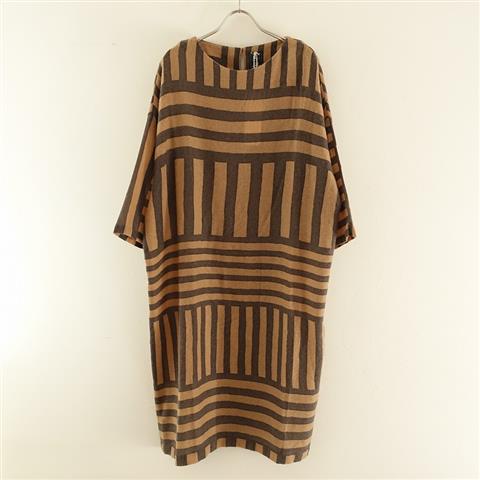 デザイン:mina perhonen「ladder」のカシミヤガーゼボーダーストライプワンピースです。カラーはダークグレー×ブラウンベージュです。カシミヤ100%の起毛ガーゼに、手書きのボーダーとストライプのプリントがあしらわれております。後ろ首のスリットはボタン・ループ留めです。ドロップショルダーのプルオーバーワンピースです。裏地・ポケットはございません。本体価格は68,000円+税の商品です。