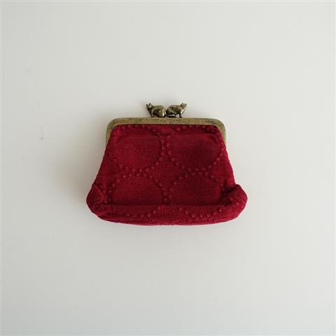 カラーは落ち着いたレッドベースに同色で「tambourine」のテキスタイルが施されたデザインで、クラシカルな雰囲気のあるがま口のポーチです。