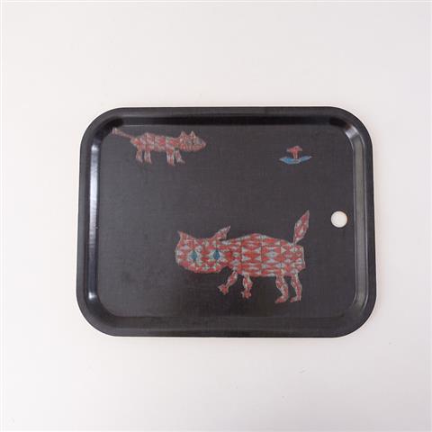 カラーは濃淡スミクロベースにオレンジレッド・ターコイズブルーなどで「Tama」のテキスタイルが施されたデザインで、サイドに小さな穴が開いたトレイです。