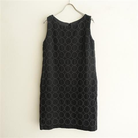 デザイン:mina perhonenのtambourine 刺繍ノースリーブワンピースです。カラーはブラックで、くったりとした絹麻綿の混紡地で仕立てられ、ダークグレーのテキスタイル刺繍が施されています。後ろフック&ファスナーで着脱でき、両サイドにシームポケット、裏地付きです。