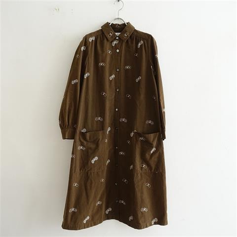 デザイン:mina perhonen laundryのchoucho コーデュロイワンピースです。カラーはダークブラウンベースにホワイトの蝶刺繍入り(表記はbrown)で、薄手のコーデュロイ素材です。前肩・背上部にギャザーが施されており、フロント&袖口ボタンで着脱できます。前腰左右にパッチポケットがあり、裏地は付いておりません。本体価格38,000円の商品です。