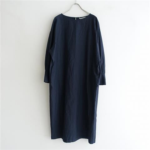 デザイン:mina perhonen neutraali「isle」の綿絹ドビーストライプワンピースです。カラーはネイビー×ホワイトです。コットンとシルクの薄手のピンストライプ生地で仕立てられています。後ろ首のボタン・ループ開きのプルオーバードレスです。カフスを広めにデザインされ、カフスの内側と外側の地の目が変えられられています。バックウエストにはタブベルト付き、両腰にシームポケットがございます。後左腰に“neutraali”のネームタグが付いています。定価は60,500円(税込)の商品です。