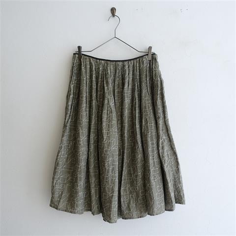 デザイン:mina perhonenのcube コットン刺繍スカートです。カラーはグリーン系ダークグレーカーキ×ホワイトで、薄手生地に刺繍があしらわれており、裏地が付いております。ウエストはダークブラウンのロープに切り替えられ、たくさんのピンタック入りでふんわりとしたシルエットになっており、左サイドファスナー開閉で着脱できます。