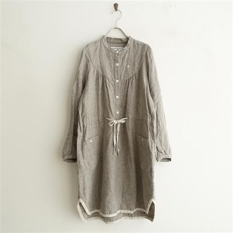 デザイン:mina perhonen laundryのchoucho スタンドカラーリネンシャツワンピースです。カラーはグレーベージュ×オフホワイトのミックス織りです。微起毛地で仕立てられており、ヨーク下はギャザー入りで、フロントボタン半開で着脱できます。chouchoのワンポイント刺繍があしらわれ、ウエストはひも入り、両サイドにポケット、着丈はフロント側が少し短くなったデザインです。