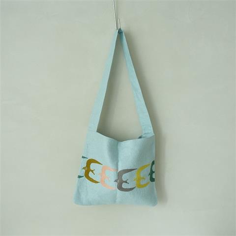デザイン:mina perhonenのgo! ショルダーバッグです。カラーはライトブルーベースに、グリーン、イエロー、グレー、ピンクオレンジ、ライトブラウンで鳥の刺繍が施されたデザインです。開口部はスナップボタン開閉でフラップ付きです。内側はsleeping roseの裏地付きで、オープンポケットが2つございます。素材は、表生地が麻100%で、刺繍部分の上糸が綿100%、下糸がポリエステル100%、裏生地が綿100%です。本体価格15,000円の商品です。
