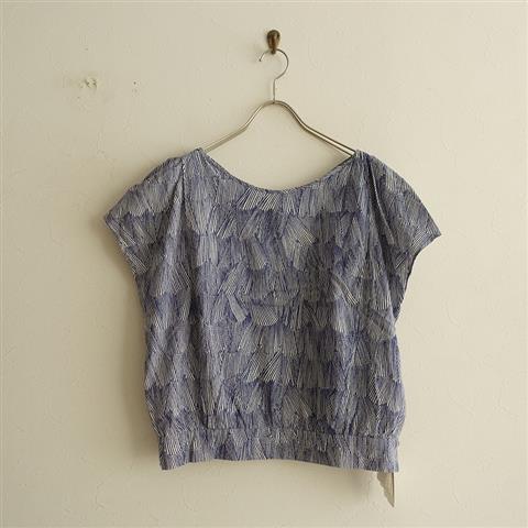 デザイン:mina perhonenのripple marksブラウスです。カラーはオフホワイト×ネイビーの砂紋柄(表記はブルー)で、肩から裾にかけてタックがあしらわれ、両サイドのスリットはループボタン留めです。