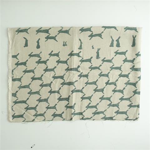 デザイン:mina perhonenのrun run run プリント生地です。カラーはライトサンドベージュベースにグリーングレーで、うさぎたちが群れをなして駆ける様子を描いたテキスタイルプリントの張りのあるリネンのような生地感です。
